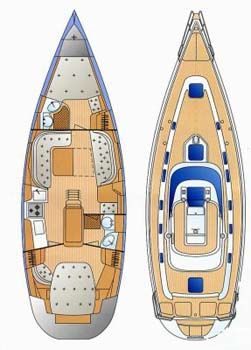 Mittelcockpit, Vorschiffskabine 2 Kojen, sehr große Eignerkabine achtern, Salon mit Pantry, Naßzelle mit WC, Waschbecken und separater Dusche.